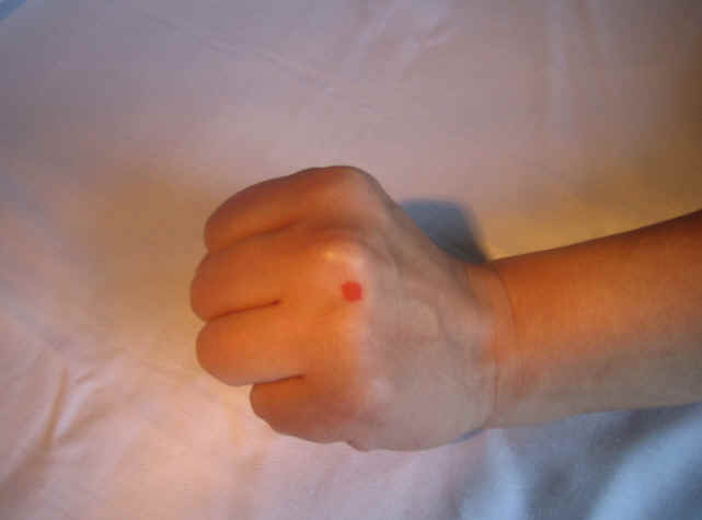 十八、指麻穴 定位:位于手部,半握拳第五掌骨中点处。 局解:在小指斥册第五掌骨小头后方,当小指掌肌腱起点处,有指背动静脉,手背静脉网,布有尺神经手背支。 取穴原则:同侧取穴。 特点:针刺尺神经手背支出现的针感为宜。 手法:直刺手法或滞针手法。 针感:以局部出现的酸麻为宜。 功能:醒脑开窍,调节神经,止痛消炎止麻。 主治:末梢神经炎引起的手指麻木,还可用来治疗中毒昏迷休克、糖尿病、神经衰弱、精神分裂症、落枕、急性腰扭伤。 按语: 是以功能主治定名的特定穴位。主治各种原因引起的末梢神经炎,对手指抹抹的病人为巩固其疗效,治疗的同时必须减少冷水刺激。对糖尿病引起的末梢神经炎,还需配合治疗糖尿病的相关穴位,进行综合治疗,才能从根本上缓解症状。 歌诀: 指麻穴位透咽痛, 同侧取穴效果好。 布尺神经手背支, 休克昏迷落枕是。 (与咽痛穴对称)