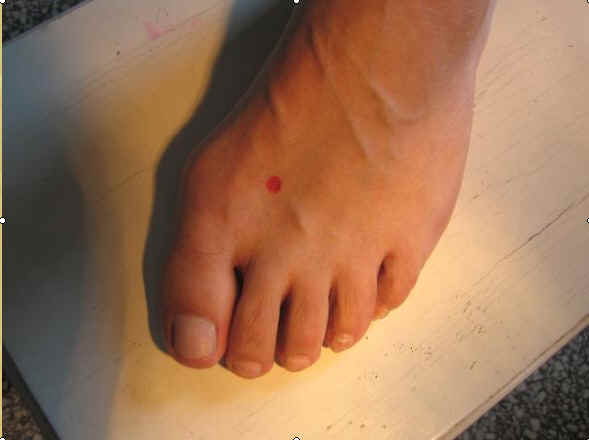 三十六、头痛穴 定位:此穴位于足背第一第二趾骨结合之前凹陷中。(太冲与行间之间) 局解:在拇长伸肌腱外缘,第一骨间背侧肌,布有木趾短伸肌,足背动脉网,为腓深神经布有趾背神经。 原则:交叉取穴。发病时间短用男左女右取穴。发病时间常采用左右交替取穴。 特点:以针刺趾背神经后出现的针感为宜。 手法:上下提插,可滞针。 针感:以局限性针感出现的酸麻胀为主。 功能:消炎止痛解痉,降压,缓解胆道括约肌痉挛,活血化淤,疏肝理气,健脾和胃,醒脑开窍。 主治:偏头疼、神经性痛疼、血管性头疼、颈性头痛、高血压性头痛、低血压性头痛、副鼻窦炎头痛、外感头痛。临床还可用于治疗近视、青光眼、手指震颤、血小板减少、急性肝炎、神经衰弱、胆囊炎。 按语: 临床用于治疗头部病变为主,该项研究获科技进步奖,针刺此穴还可缓解胆道括约肌痉挛,作用大于组三里,阳陵泉。 歌诀: 头痛穴为脚趾中, 趾背足底内神经。 交叉取穴来取穴, 头痛病变用之灵。